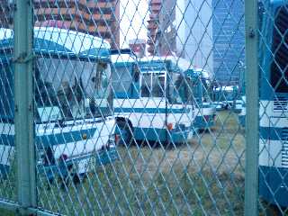 JR新今宮北側、大阪府警なにわ別館にはカマボコ約30台停まっている。放水車2台は運転手が乗り、エンジンをかけて待機している。